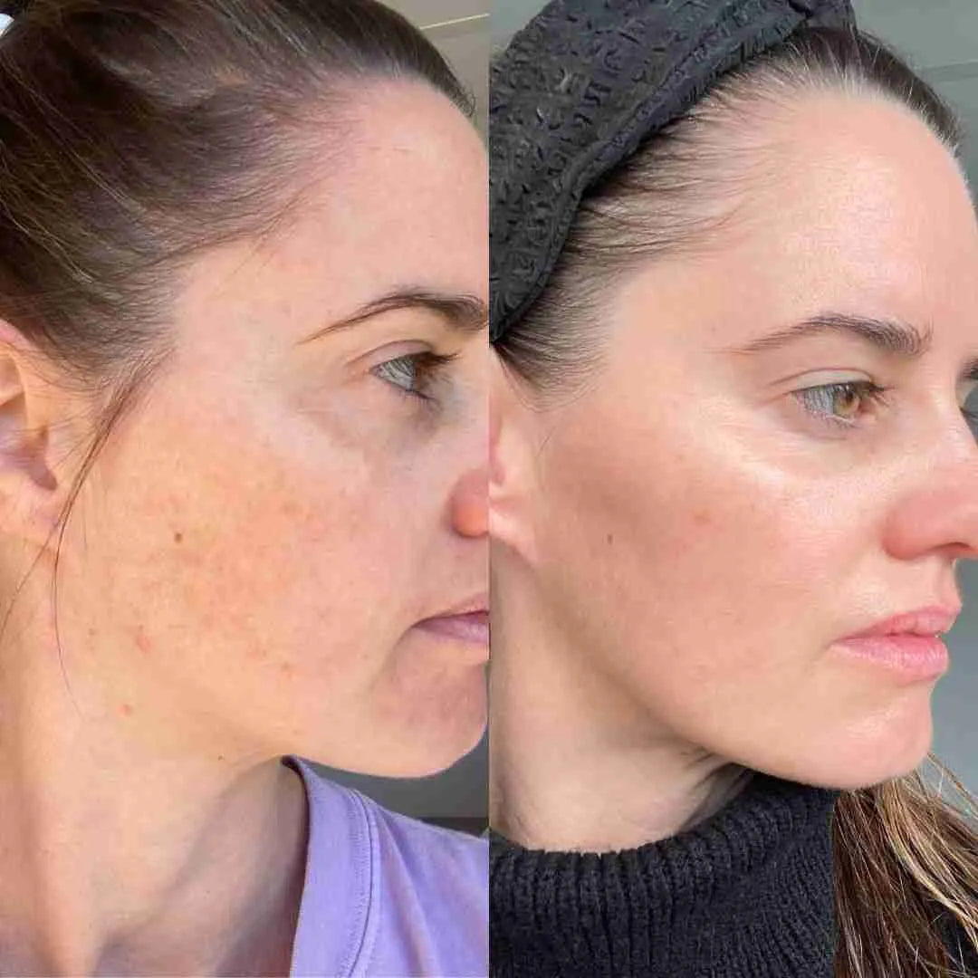 There is little to no downtime. Mild redness may occur immediately after use but usually subsides within a few hours. Most users prefer using the kit in the evening and continuing with gentle skincare afterward.
